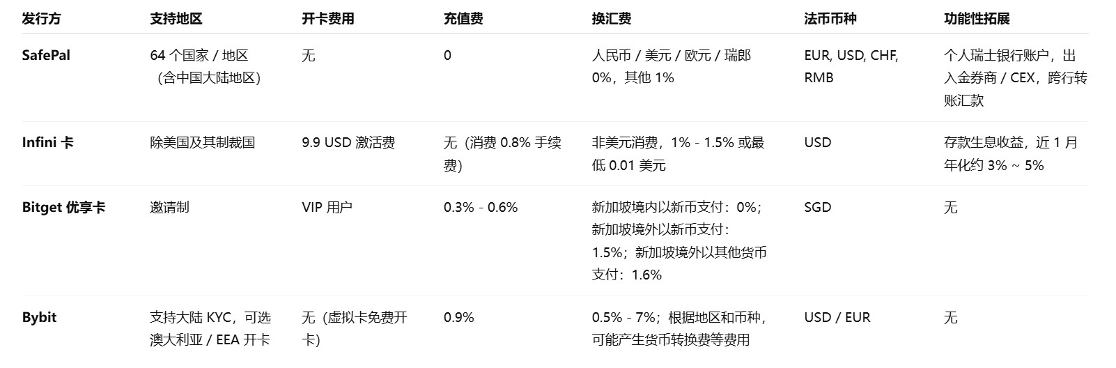 The author has also sorted out current market crypto payment card products with good reputation, making a rough comparison of account registration thresholds, fee structures, and compliance functionality based on actual usage: