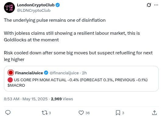 -PPI (inflation) data came in soft today, leading to optimism re: risk assets, h/t @LDNCryptoClub: