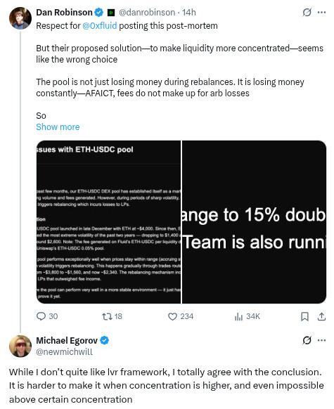 -Interesting discussion between @danrobinson and Curve founder @newmichwill_ on a post-mortem posted by @0xfluid on some issues with their ETH-USDC pool: