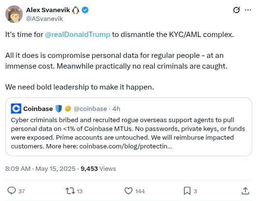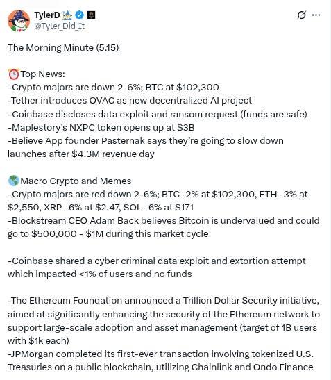 -Major headline of the morning is Coinbase losing some very sensitive user info to hackers who then tried to extort the exchange, h/t @Tyler_Did_It: