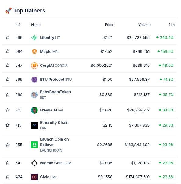 Chains are mostly red today. Only top 25 chains green on the daily are Sei (#16), BSquared (#18), Cardano (#22), and Taiko (#24).