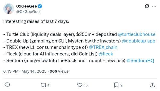 -Some raises over the last seven days include Turtle Club, Double Up, TREX, Fleek, and Sentora, h/t @0xGeeGee: