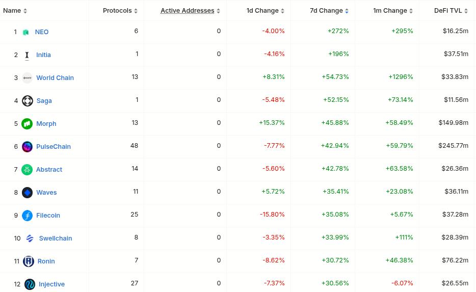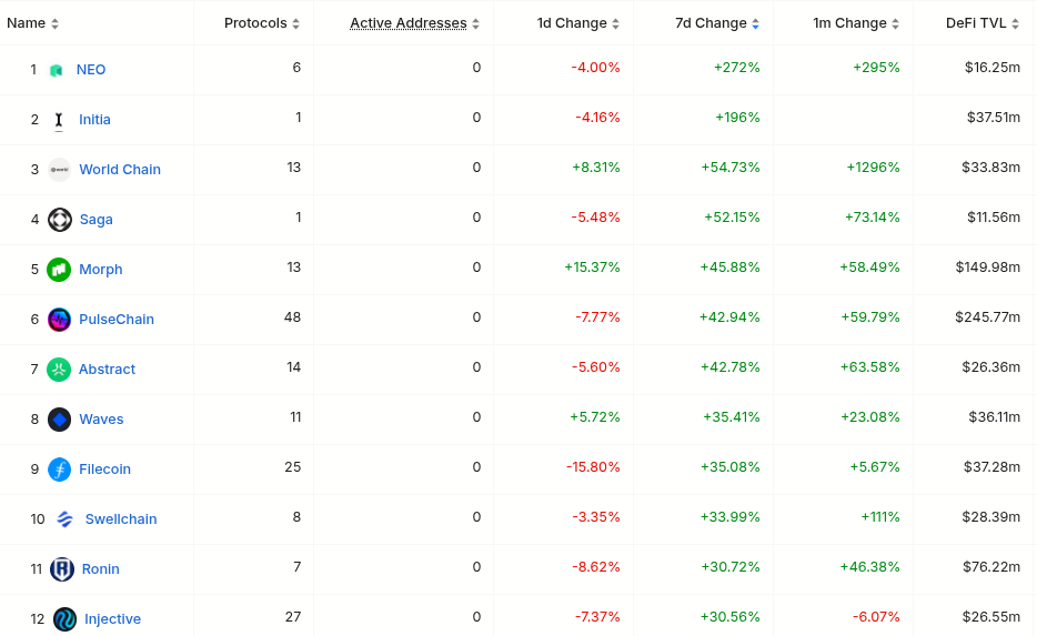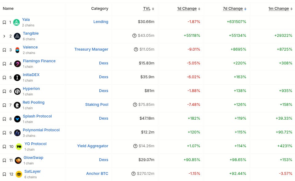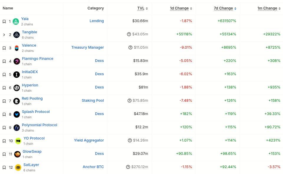 Here’s The Top 12 Best-Performing Chains By TVL On The Weekly With At Least $10M TVL: (from @DefiLlama):