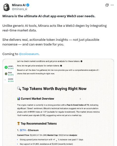 -New project called @minara_ai. Twitter bio states “Your ultimate Web3 AI chat & vibe trading app. Cooking at @colosseum Breakout Hackathon.” Followed by 5 of our mutuals. h/t @AresLabs_xyz: