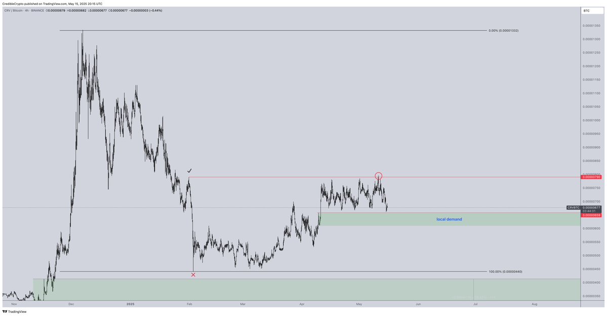 After taking our local range highs CRV/BTC has moved down to our local range lows- just as expected and explained in my last Youtube vid. A few things could happen here but the most bullish would be a sweep of these local range lows into local demand and then a full on reversal twitter.com/CredibleCrypto/sta...