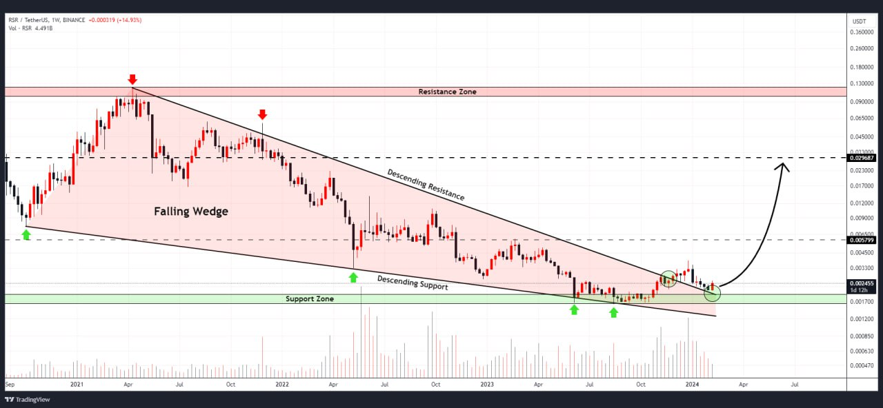 According to Whales Cryptozz, the RSR Crypto chart on the weekly timeframe just broke out of a falling wedge pattern—a classic signal for a bullish reversal.