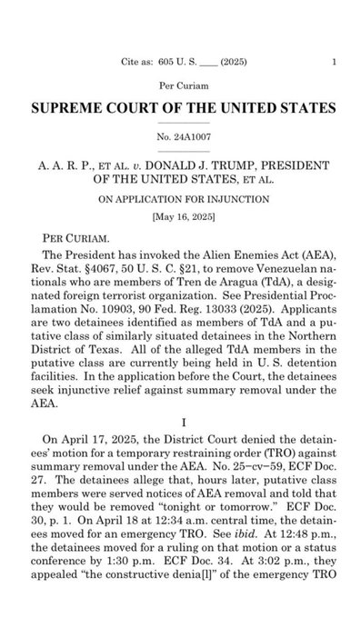 🚨Just in: The Supreme Court rules 7-2 to stop the Trump administration from deporting a class of Venezuelans under the Alien Enemies Act