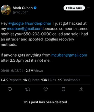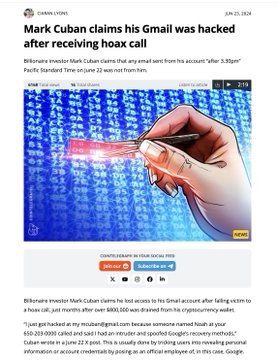 On June 23, 2024 Mark Cuban fell victim to a social engineering scam losing crypto assets from his public wallet markcuban.eth