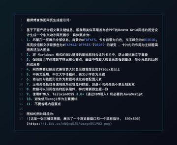 The last step is to generate the web page. This part is very simple. Enter the prompt word, the Markdown link of the icon image, and the product introduction document or other documents you need AI to refer to, and wait for the result.