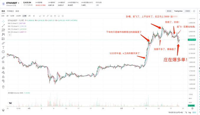 Ethereum's main force is definitely selling. Violently pulled up to 2700, pulled back to 2450, and then sideways. Then giving people a chance to buy in, making them think it's stable. Smashing the plate down to 2300, with a violent rebound, making people think they can buy the dips. The market makers will sell during sideways and downward movements, while also setting up short positions. A gain of double the bottom price is enough to cut a big wave. Because Ethereum can accommodate such large funds... Might pull another wave to attract people to buy in.