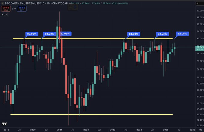 With the exception of Jan 2021... BTC.D+ETH.D+USDT.D+USDC.D likes to top at around 82% In Jan 2021, this metric went to almost 90%. Currently at 79.64%