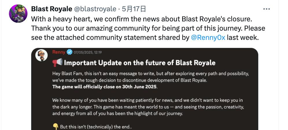 Coincidentally, in 2025, multiple chain game projects like Blast Royale, The Walking Dead: Empires, and The Mystery Society consecutively announced shutdowns or development pauses.