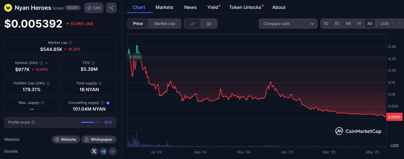 Within just one day, the NYAN token dropped by as much as 37.2%, and its FDV subsequently plummeted to around 5M, nearly 99% evaporated from its historical peak.