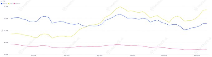 TVL on Ethereum L2 Base is rebounding sharply and is nearing its previous highs. And while Arbitrum shows some recovery, Optimism remains weak, with TVL still hovering around its April lows.