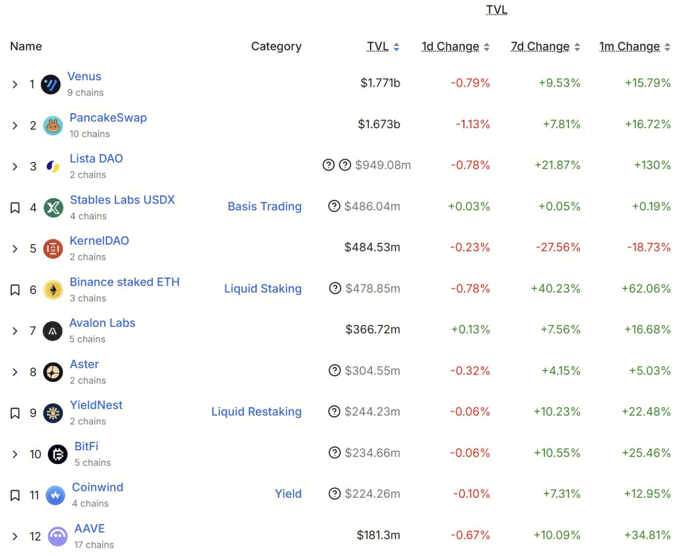 Besides the continuously rising transaction volume, defillama data shows that BNB Chain ecosystem projects' TVL generally gained 10-20% growth in the past month. New users and funds are gradually spreading and settling into various protocols within the ecosystem. Binance Alpha, as the ecosystem's outpost and entry point, has a more profound strategic goal of building a multi-layered, sustainable system. Regardless of the track, all protocols are objects of BNB Chain's development and support. The settlement of funds means real users are continuously flowing in and expanding, with protocol competitive positions constantly rising, allowing each project to reach a new level riding the BNB Chain tailwind.