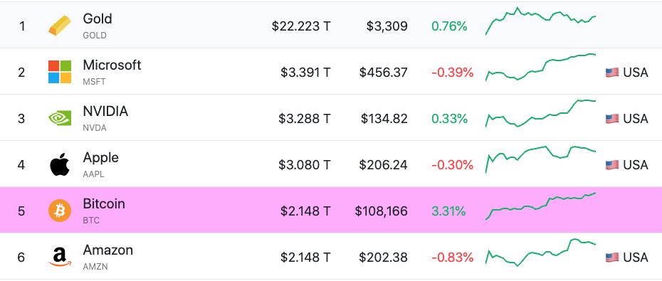 "Bitcoin surpasses Google and is now the 6th largest asset on the planet, overtaking Alphabet (Google) with a market cap of over $2 trillion. BTC is now only behind Gold, Microsoft, Nvidia, Apple, and Amazon. This is not just a number—this is history in the making," wrote Bitward Investment's co-founder and COO, Dariusz Kowalczyk.