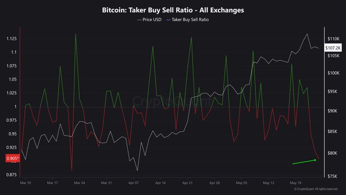 ⚠️ WARNING: Bitcoin's Taker Buy / Sell ratio on exchanges has fallen to its lowest level in over a month. This shows more selling pressure on exchanges over the past 2 days. Will BTC hold above $100k?