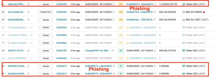 #PeckShieldAlert A #ZeroTransfer scammer grabbed ~1.7M $USDT from 0x86C0...2604. Intended Address: 0x4668D1Fe87444a4d7508e83c89bfDAF1117e6B76 Phishing Address: 0x4668EE748c88DA4FEc595773b22f96f366eD6B76