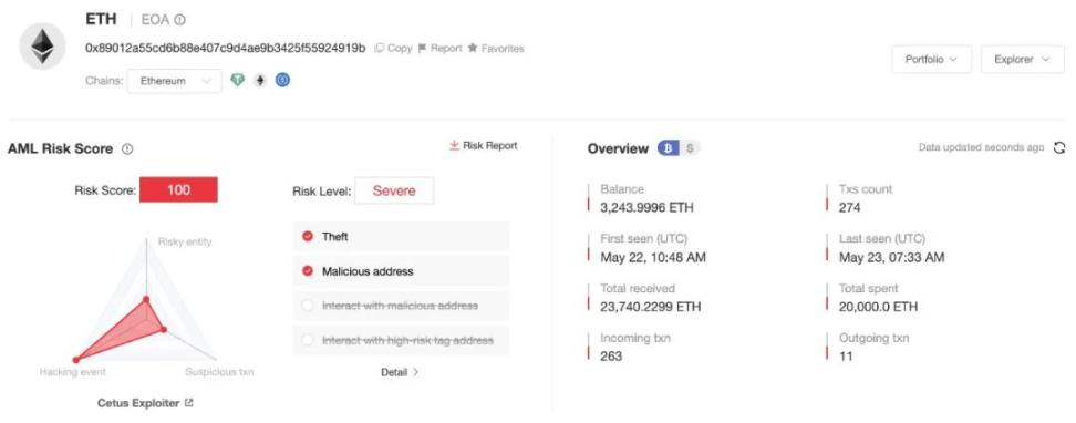 Next, we will use the on-chain anti-money laundering and tracking tool MistTrack to analyze the EVM address 0x89012a55cd6b88e407c9d4ae9b3425f55924919b that received cross-chain funds.