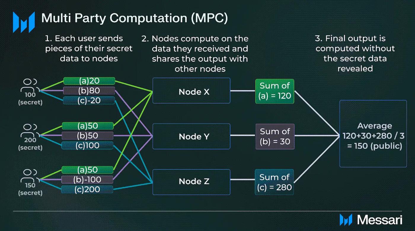 Challenges of MPC: Privacy does not come without a cost. MPC protocols often incur overhead, primarily in terms of communication. To jointly compute, parties must exchange multiple rounds of encrypted messages. The number of communication rounds (sequential back-and-forth messages) and their bandwidth requirements grow with the complexity of the function and the number of parties involved. Ensuring that computations remain efficient is tricky with more parties involved. There is also the issue of honest versus malicious actors. Basic MPC protocols assume that participants follow the protocol (may be curious but do not deviate). Stronger protocols can handle malicious actors (who may send false information in an attempt to break privacy or correctness), but this adds more overhead to detect and mitigate cheating. Interestingly, blockchains can help by providing a framework for punishing misbehavior. For example, staking and penalty mechanisms can be used if a node deviates from the protocol, making MPC and blockchain a complementary pair.
