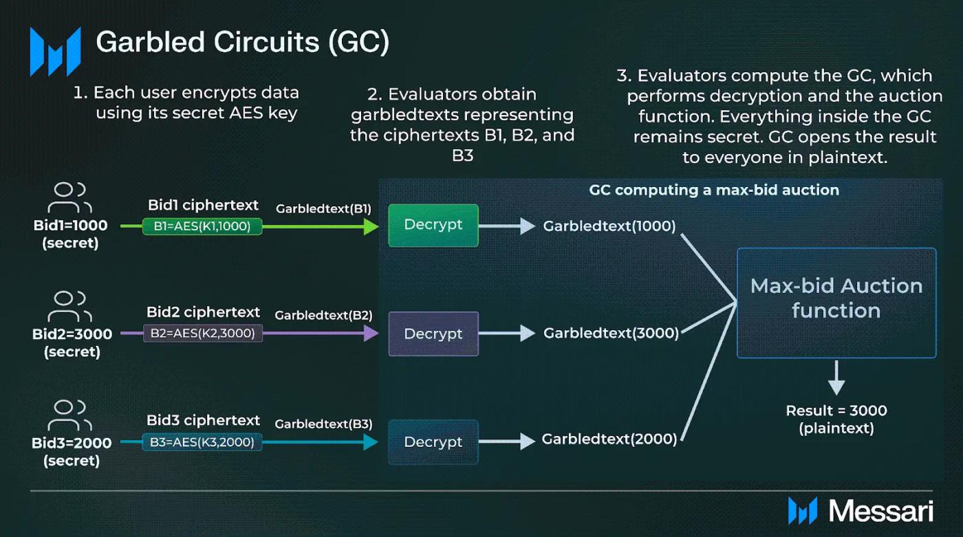 - A garbled circuit (GC) for performing computations on standard encrypted data.