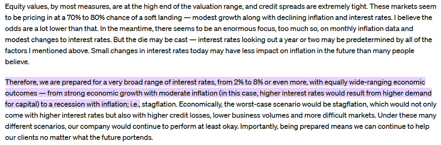 Jamie Dimon has been too bearish on the bond market for a while now. His 2023 Chairman Letter had strong doomer vibes. -Soft Landing skeptic, -Higher rates coming, -Rates as high (or higher) as 8%. Incidentally, the 10-yr is exactly unchanged since he published these comments.