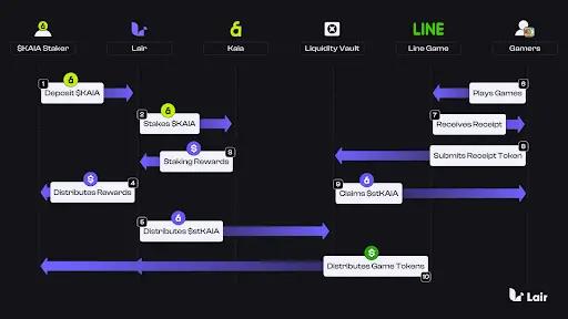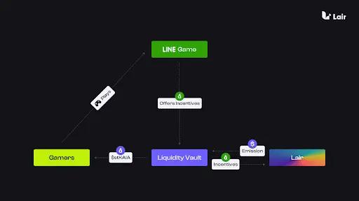 As mentioned earlier, Lair's LSD pool will inject part of the staking rewards into the game reward pool under Liquidity Vaults. When LINE game users participate in the game, they will receive a receipt token, which can be used to redeem $stKAIA rewards in the Vault.