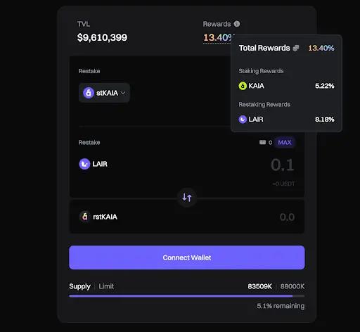- Users can re-stake $stKAIA and $LAIR together to mint $rstKAIA, thereby further obtaining Lair platform token incentives