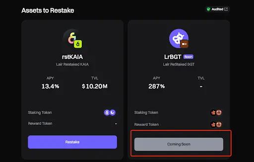 At present, although LrBGT does not support re-staking, we have seen that Lair Finance shows that LrBGT's secondary staking will be launched soon. Considering the way of obtaining game token incentives through secondary staking on Kaia, perhaps after users perform secondary staking of LrBGT, they may be able to further obtain token airdrop rewards from other projects on Berachain, etc.