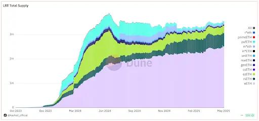In fact, after a short-lived frenzy, the LRT market gradually entered a phase of slowing growth as several projects completed TGE and distributed airdrops to users with accumulated points last year. Data shows that since May and June 2024, the total supply of LRT tokens has begun to decline after reaching a peak of $3.88M, and has maintained a very limited and slow growth level for a period of time thereafter, and the market activity has also tended to stabilize or even cool down.