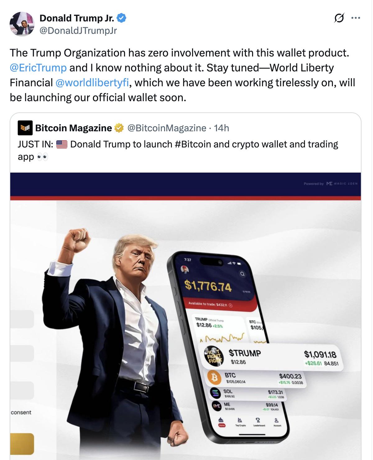 both posted on X that they knew nothing about the $TRUMP Wallet. Eric emphasized that the Trump Organization had never approved the project and revealed that their own wallet, tied to World Liberty Financial (WLFI), was still in development.