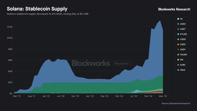 7/ Solana's stablecoin supply decreased by 13.5% MoM, closing May at $11.39B.