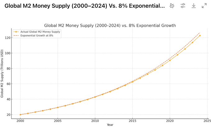 Since 2000 Global Money supply has been growing exactly at 8%. 1/N