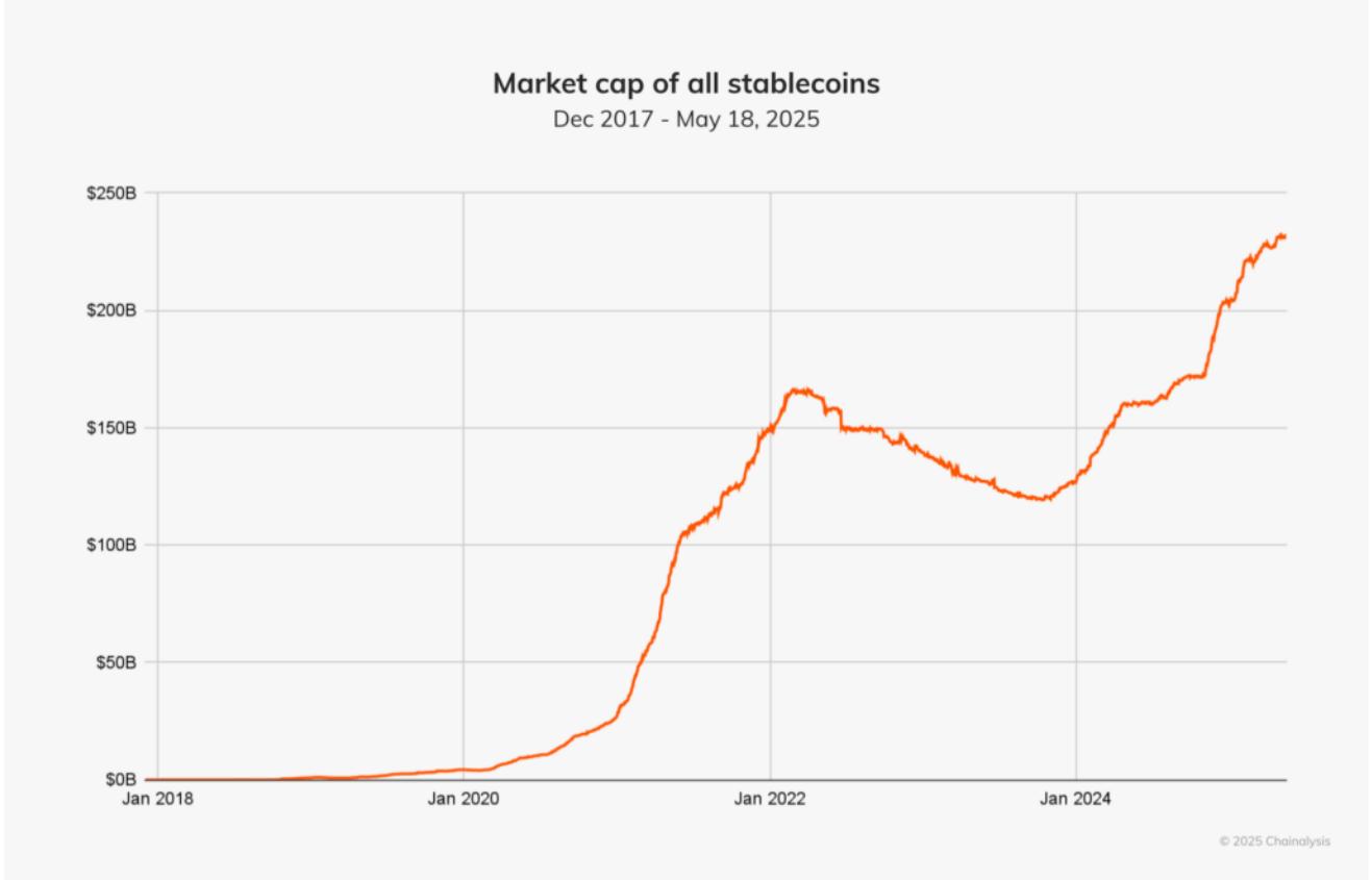 Since 2020, stablecoin adoption has seen exponential growth. According to a report published by Deutsche Bank in May, the market capitalization of stablecoins has surged from just $20 billion in 2020 to an impressive $246 billion in 2024. As of May 2025, the total market cap stands near $232 billion, reflecting their increasing role in both decentralized finance (DeFi) and traditional financial markets.