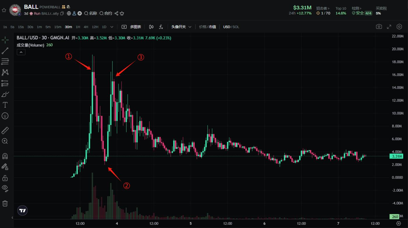This token, focused on "on-chain lottery", attracted numerous on-chain gamblers with its "hourly draw" feature. According to GMGN market data, its market cap rose from millions to $19 million (see ① in the image), then plummeted to less than $2 million within hours (see ② in the image), before surging again with FOMO, approaching its previous high (see ③ in the image), like riding an on-chain emotional roller coaster.
