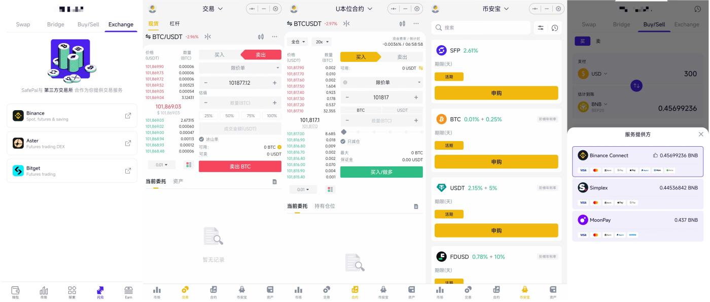 SafePal is currently the only wallet product deeply integrated with Binance—— the APP directly provides Binance's spot trading, leveraged trading, contract trading, and financial functions (in sub-account form), while also lightly integrating Binance's fiat deposit and withdrawal channels, essentially allowing users to share Binance's trading liquidity and deposit/withdrawal channels within the SafePal wallet, basically meeting daily trading needs.