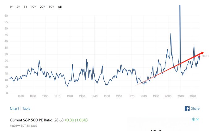 The US stock P/E ratio entered an upward channel starting from 1980.
