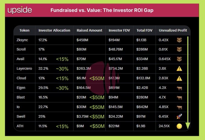 Interestingly, projects that raised over 50 million USD like Scroll, zkSync, EigenLayer, LayerZero have poor token performance, while projects like Blast, IO, Swell, ATH that raised under 50 million USD provide better performance of over x5 for investment funds.