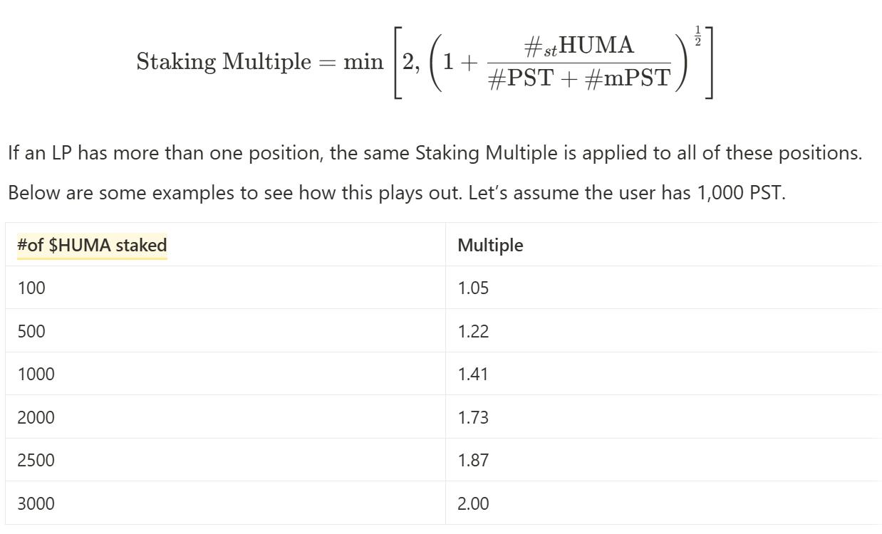 Staking Multiplier: Determined by the ratio of staked HUMA tokens to total LP tokens, providing additional LP reward bonuses. When staked HUMA reaches three times the LP token amount, the multiplier reaches a maximum of 2. The official calculation formula is as follows: