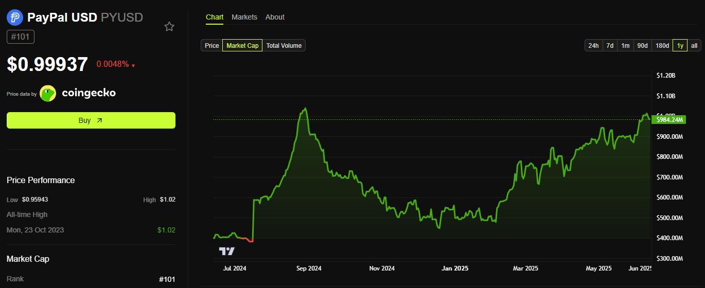 According to data from BeInCrypto, PYUSD’s market cap reached $984 million by June. This is up from $490 million at the beginning of the year. At this pace, PYUSD could soon surpass its previous $1 billion peak from August 2024.