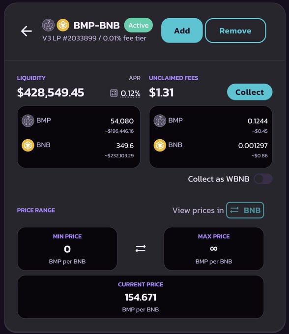 As previously announced, the $BMP tokens acquired by the team from the secondary market will be utilized to establish liquidity pools on BSC. We have established three pools: • BMP/BNB • BMP/USD1 • BMP/USDT Currently, the BNB pool serves as our primary pool with over 400K liquidity injected. Our commitment to building on BSC drives us to strengthen our connection with BSC's native token. During the initial period, we will actively monitor BSC sentiment and dynamically adjust pool weights accordingly. We believe this additional liquidity will create a more stable environment for our community and support our future growth.