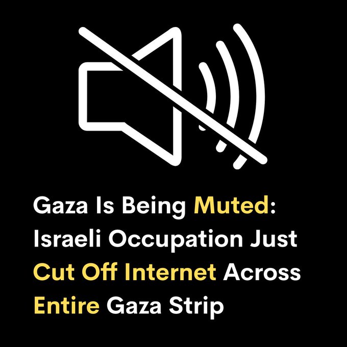 🚨BREAKING | Internet has now been cut off across the entire Gaza Strip, adding south and central Gaza to the affected areas that were disconnected yesterday. According to SAFA news agency and reports from residents using e-SIMs, all of the Gaza Strip is suffering a blackout now. This total blackout in communication has serious implications for civilians who rely on messaging networks to warn each other about airstrikes, incursions, and evacuation zones. The Palestinian Civil Defense has also reported major difficulties in locating victims in need of rescue due to the inability to communicate with them to pinpoint their location.