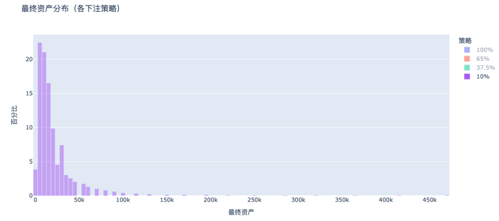 Without a bankruptcy distribution peak similar to an all-in situation, overall wealth is concentrated in the low-asset area. In comparison, 37.5% of strategies will pull out a clear long tail on the right side, achieving asset multiplication.