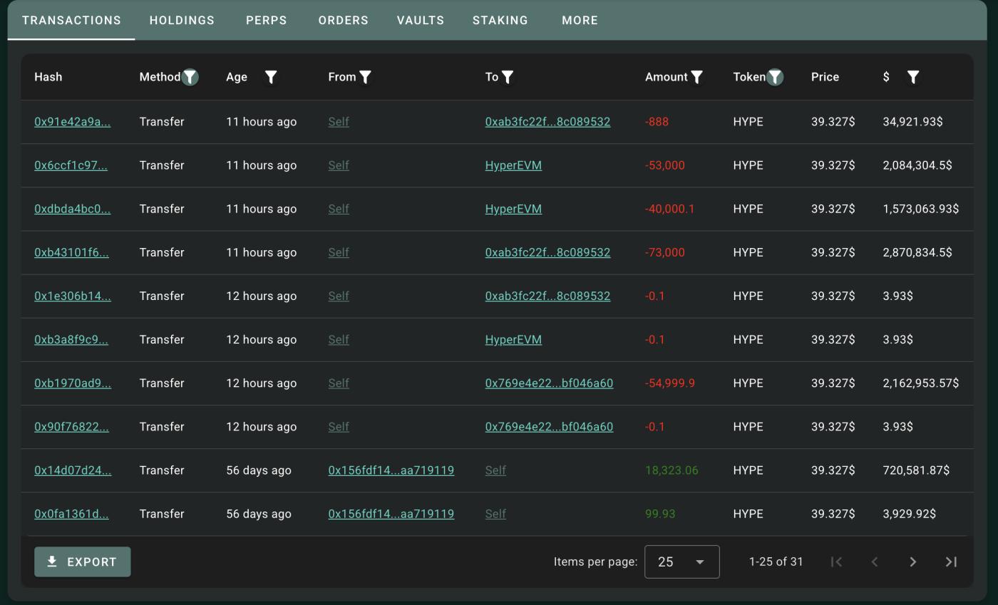 According to @obese.potato.pip's monitoring, the suspected Arthur Hayes address transferred multiple HYPE tokens yesterday, including 73,000 HYPE (about $3 million) to Flowdesk, 40,000 HYPE (about $1.64 million) to Wintermute, 53,000 HYPE (about $2.2 million) to Galaxy, and 55,000 HYPE (about $2.3 million) to Gate.