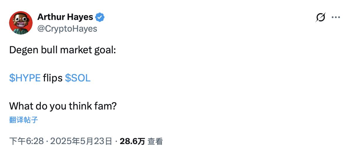 On May 23rd, Arthur Hayes posted on X that his goal in this bull market might be "HYPE market cap surpassing SOL".