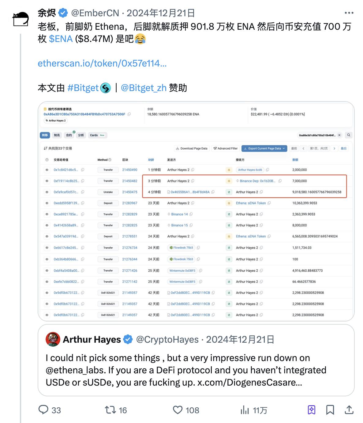 Afterwards, Arthur Hayes also transferred nearly 10 million ENA to exchanges like Bybit to dump and profit.