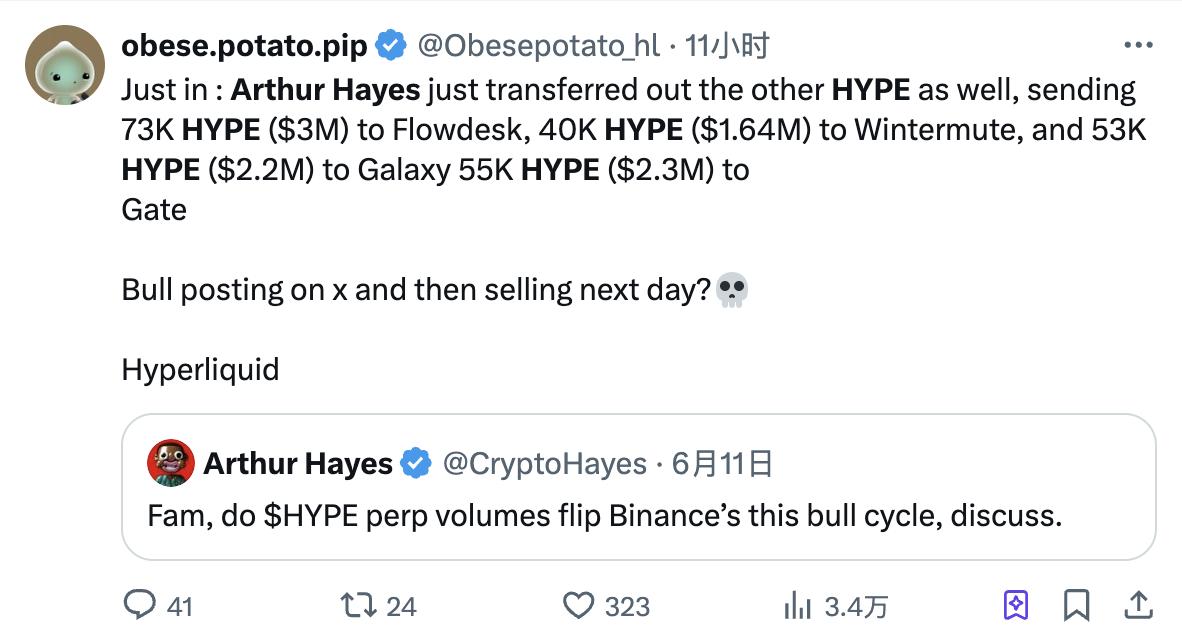 On June 12th, just one day after hyping HYPE, a Hyperliquid community member @obese.potato.pip discovered some interesting on-chain movements - Arthur Hayes seems to be selling HYPE.