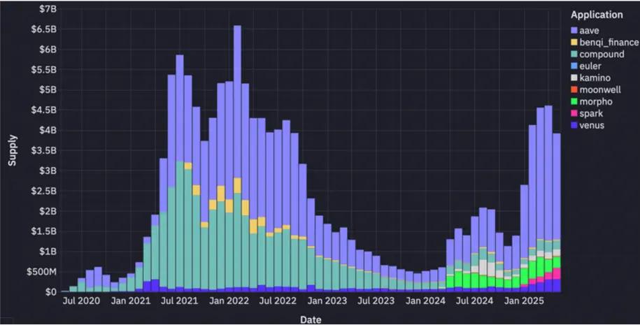 Although lending has fallen from its peak, Aave has shown strong recovery momentum , while newer protocols such as Morpho, Spark, and Euler have also gained traction.