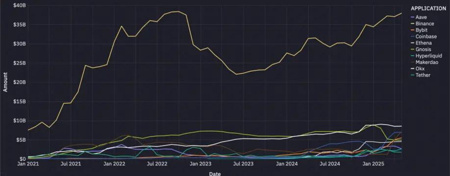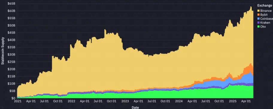 Most stablecoin supply is concentrated on centralized exchanges, with Binance taking a sizable lead. DeFi protocols and issuers also account for a significant share.