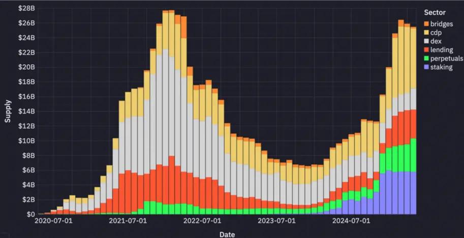 The supply of DeFi stablecoins comes from collateral, liquidity provider (LP) assets, and the settlement layer of lending markets, decentralized exchanges (DEX), and derivatives protocols. The supply of CDPs, lending, perpetual contracts, and staking has almost doubled in the past 6 months.